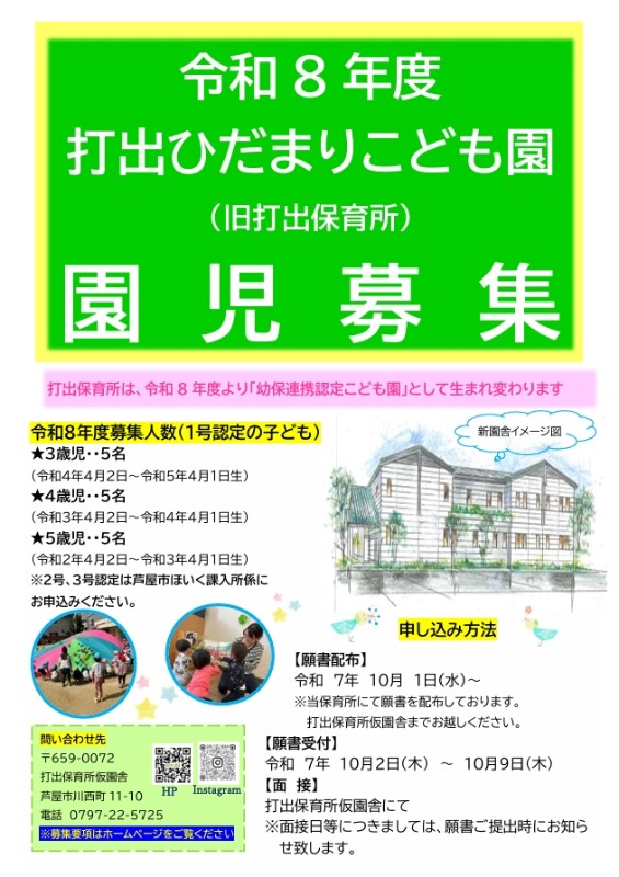 令和8年度幼保連携型認定こども園「打出ひだまりこども園」1号認定の園児募集が始まりました。