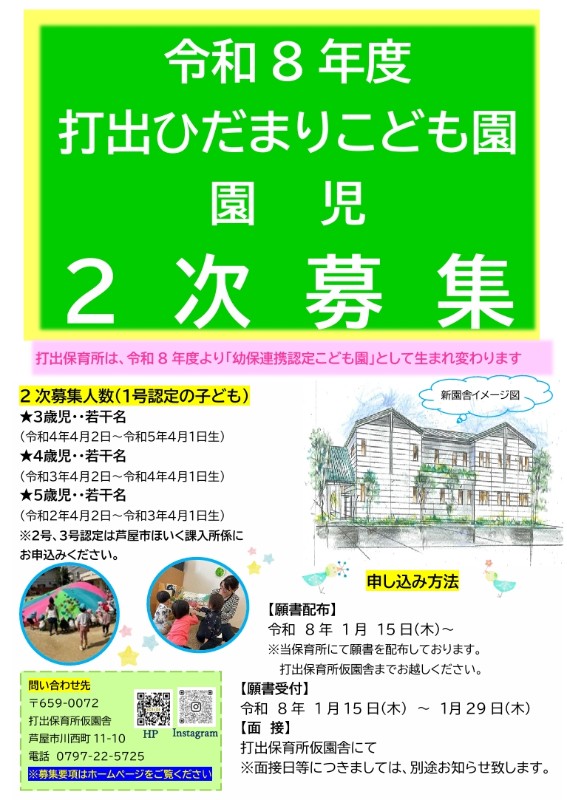 令和8年度幼保連携型認定こども園「打出ひだまりこども園」1号認定の2次募集が始まりました。